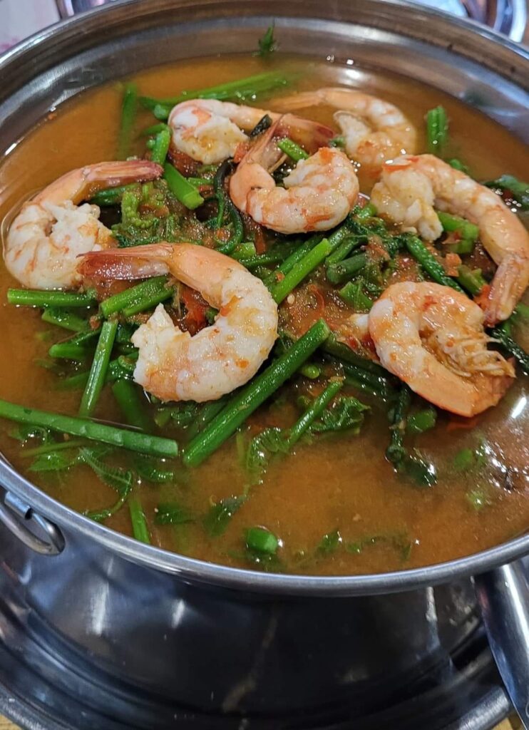 • แกงส้มชะอมชุบไข่กุ้งสด